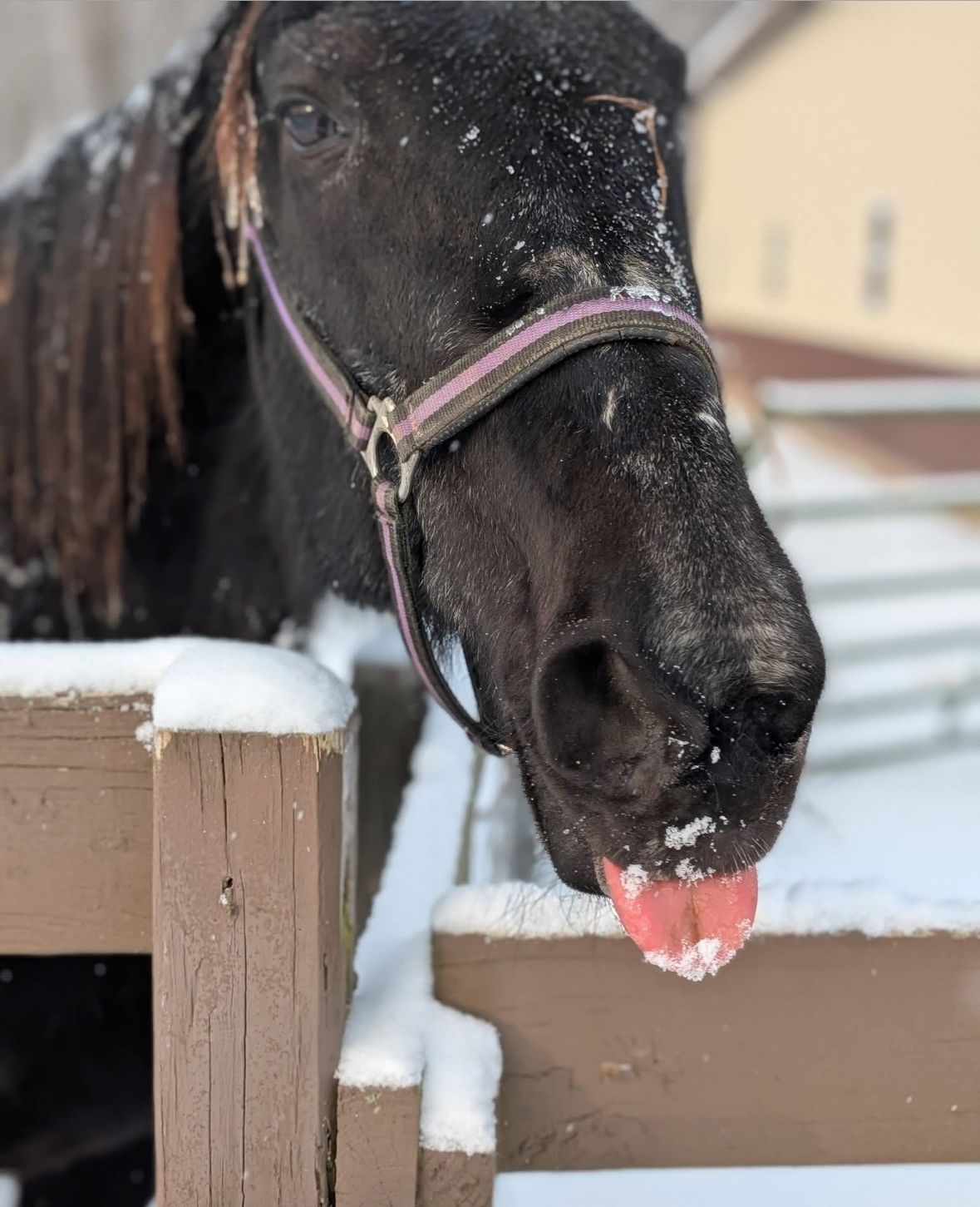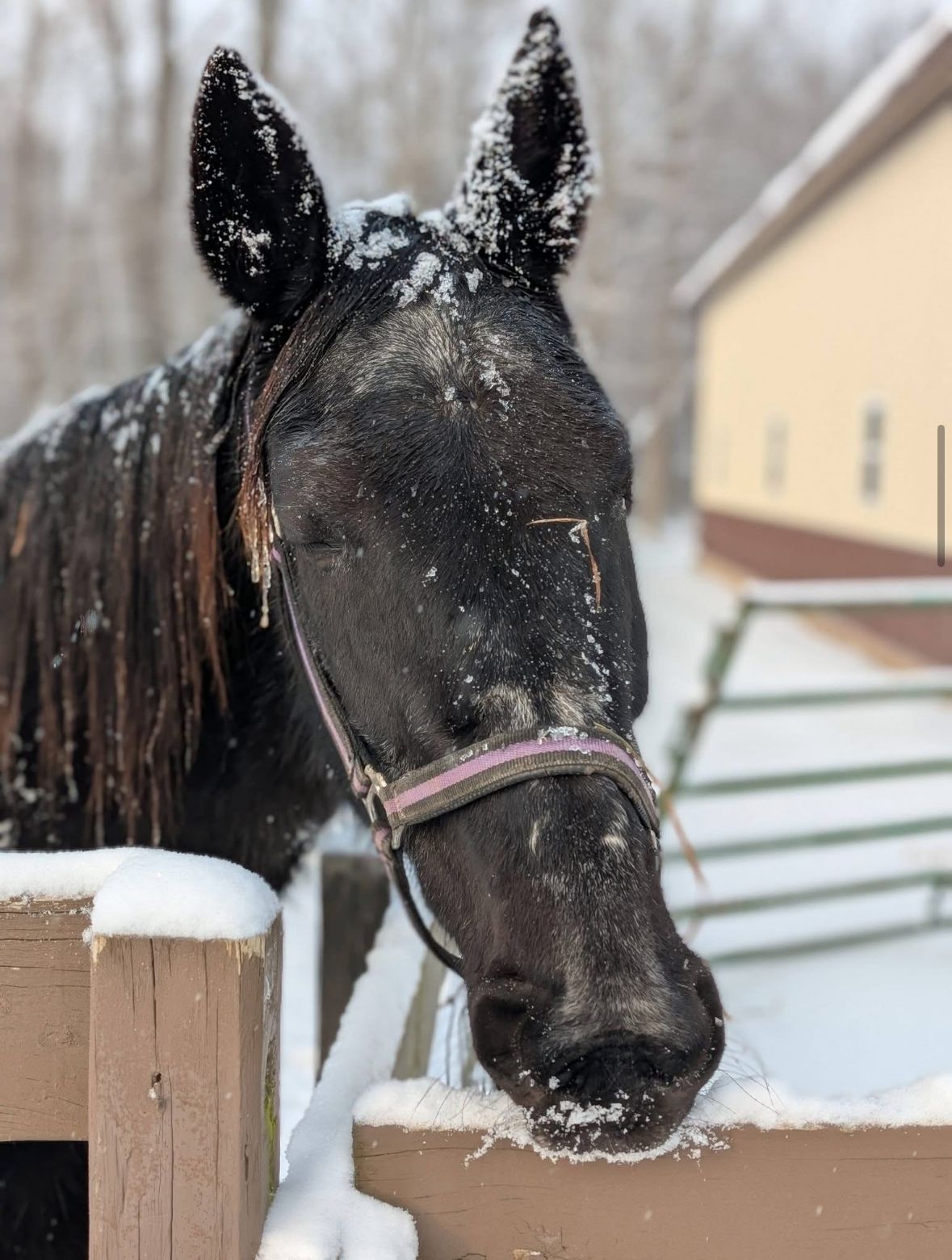 Due to her age and limited teeth, Belle needs soaked feed and soaked hay cubes as her primary diet. She also requires Pracend to manage Cushing’s. With these simple accommodations, she stays comfortable and content.