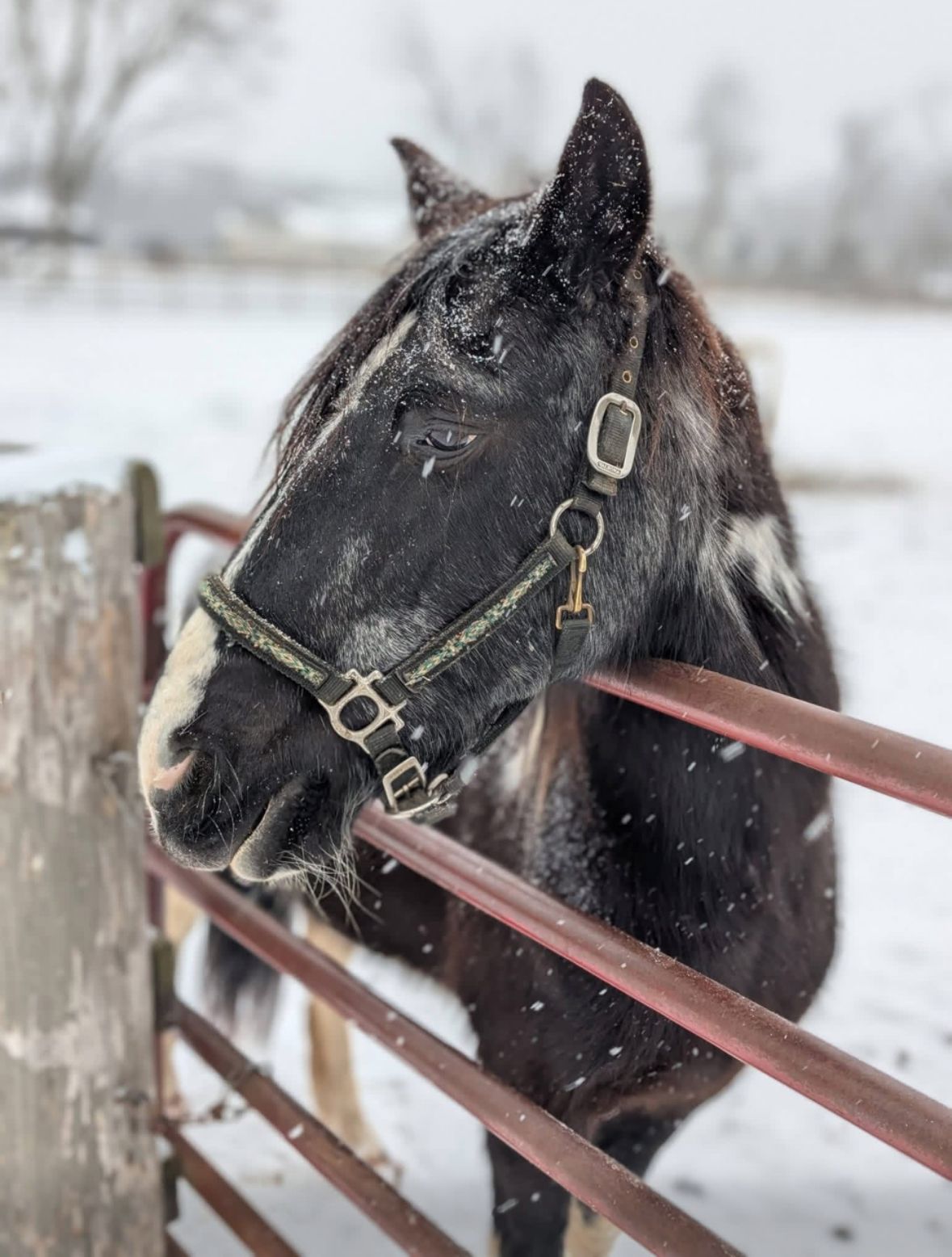 Paris does have some ongoing medical needs. She requires maintenance to stay pasture-comfortable, is kept in a quiet pasture with dry, level ground, and wears shoes with wedges due to navicular and other hoof-related issues. She also prefers to be stalled at night, especially during colder weather, where she feels safe and cozy, but can live comfortably outside with good shelter.