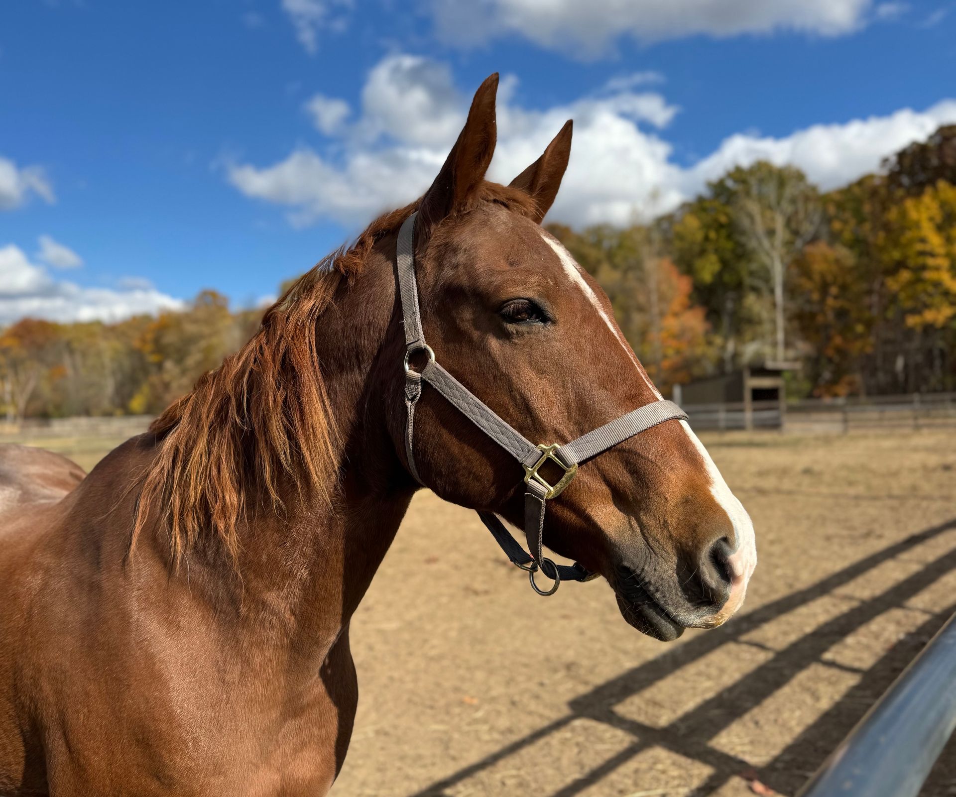Champagne is a well-mannered chestnut TB mare looking for a quiet retirement home through our rescue. She is companion-only and easy to handle, with good manners for both the vet and farrier.