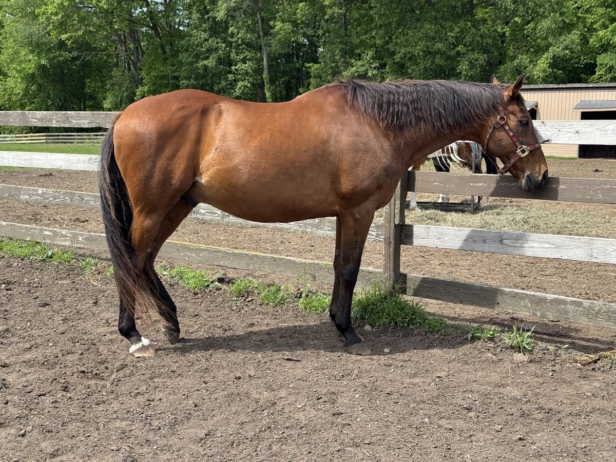 Champ is an amazing thoroughbred with a very sweet temperament. Champ loves to be spoiled, especially with treats! While he has a riding history - he is available as a non- riding companion only as he has a history of bolting in stressful situations. But overall, he's relaxed in the pasture and a good friend - he lives outside 24/7 with a group of geldings. He's well behaved for farrier & vet. He is barefoot and has no maintenance. His adoption fee will be waived for the perfect situation.